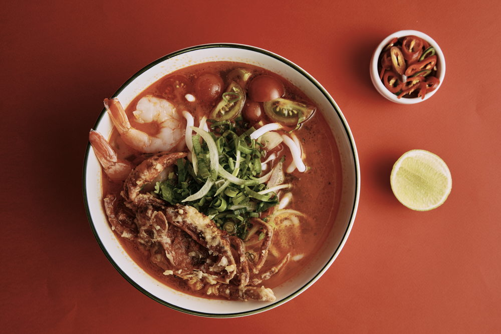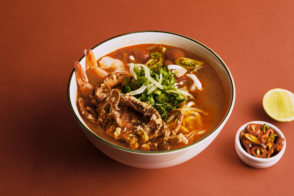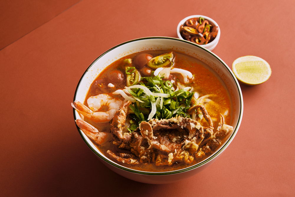 Banh Canh Cua – crab and tomato broth, banh canh noodle, fried softshell crab, quail egg, coriander